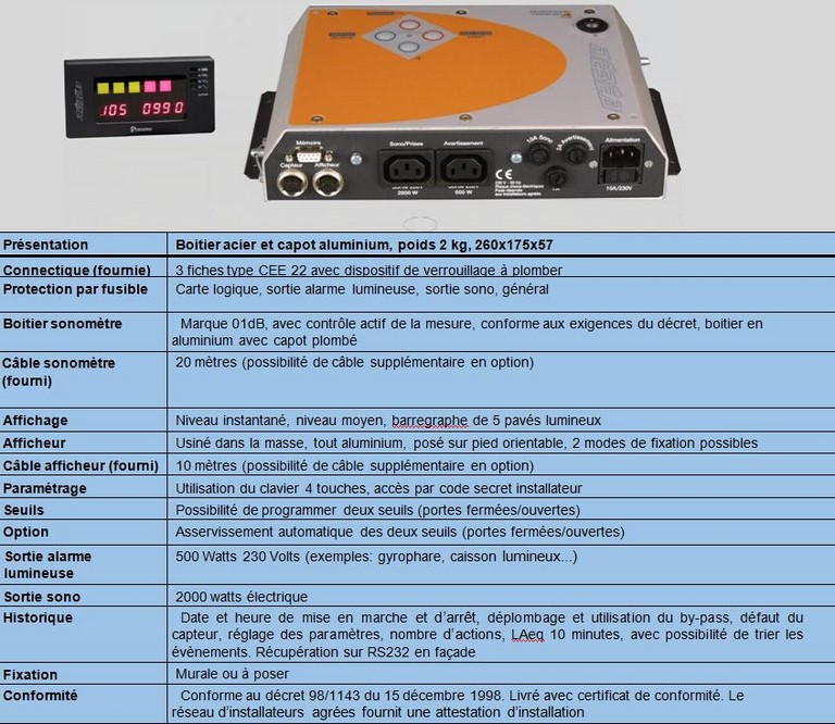 Un afficheur écran déporté restitue ces valeurs et 5 pavés lumineux de couleurs verts et rouges signalent l’approche du niveau moyen programmé. De plus, un dispositif lumineux déporté directement branché sur l’appareil sera allumé à 1 dB(A) moyen du seuil. Cette technique permet à l’utilisateur de visualiser en permanence l’évolution du paysage sonore, ainsi le limiteur interviendra uniquement si le seuil moyen à surveiller est dépassé.