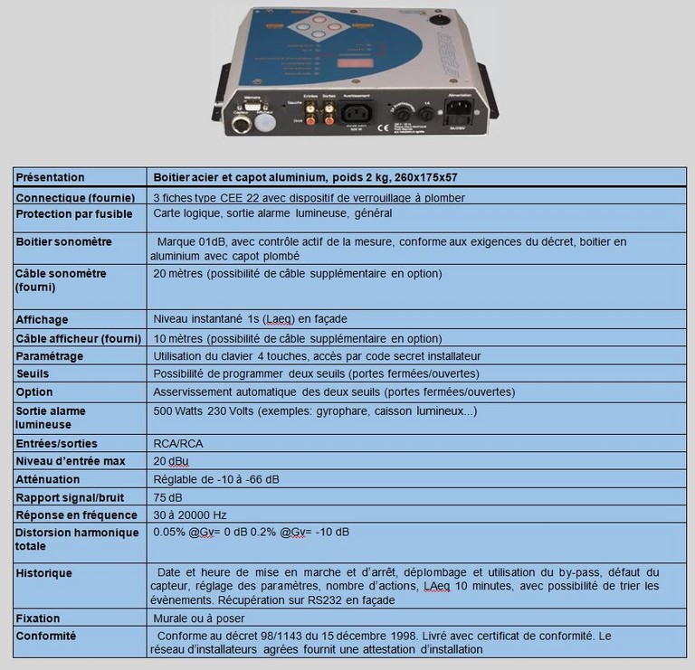 Un capteur (sonomètre) équipé d’un dispositif anti camouflage est déporté de l’appareil, il mesure le niveau de pression acoustique instantané en dB(A) (LAeq court). Un seuil préalablement programmé est surveillé, dès que celui-ci est atteint un dispositif lumineux est alimenté (exemple: gyrophare, panneau lumineux....) incitant l’utilisateur à baisser le son.